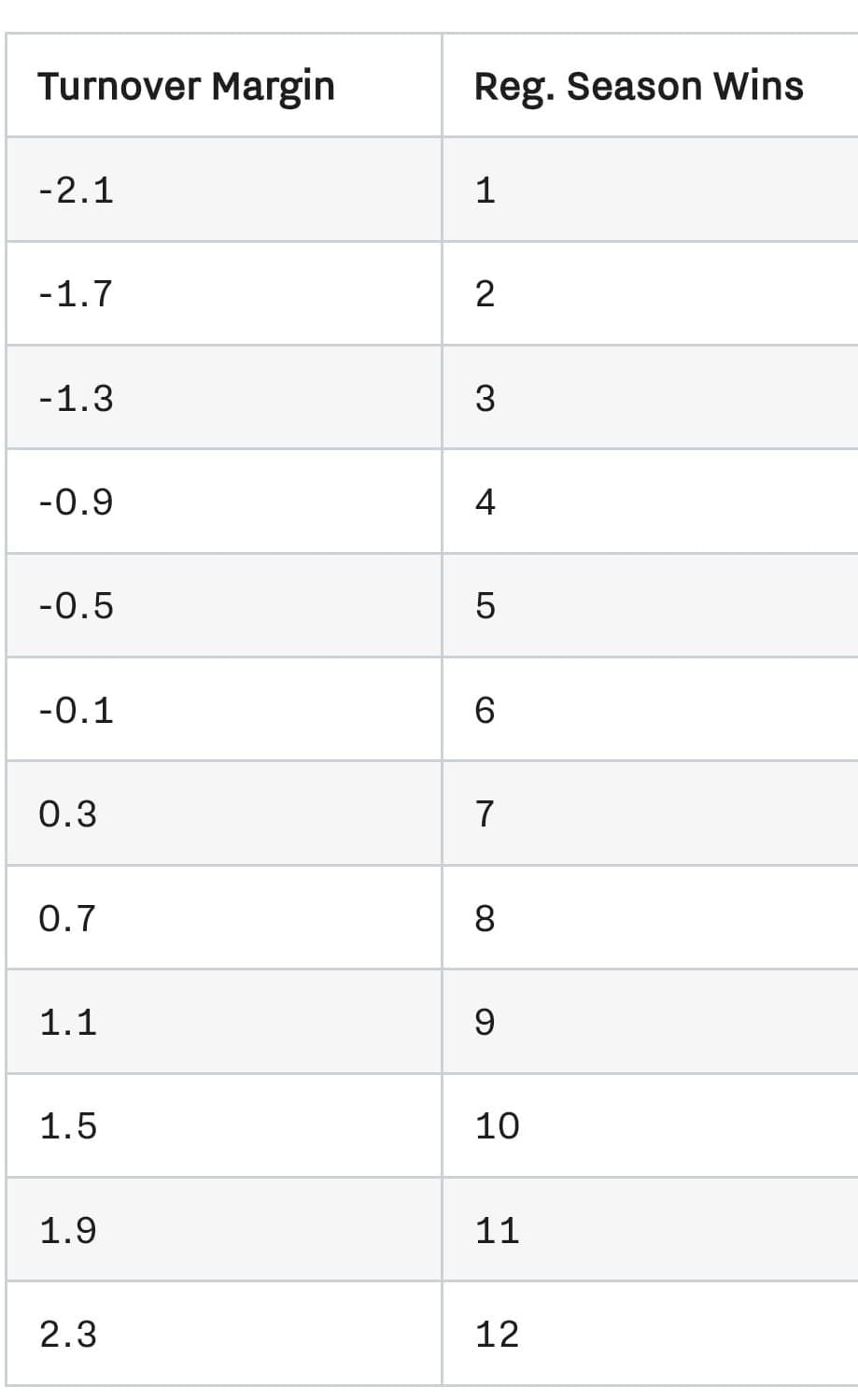 A 2013 study in SB Nation Football Study Hall, author okc__dave attempted to correlate turnover margin with probability of winning. He then created a chart that listed actual number of predicted wins based on season- long turnover margin average. ( see below).