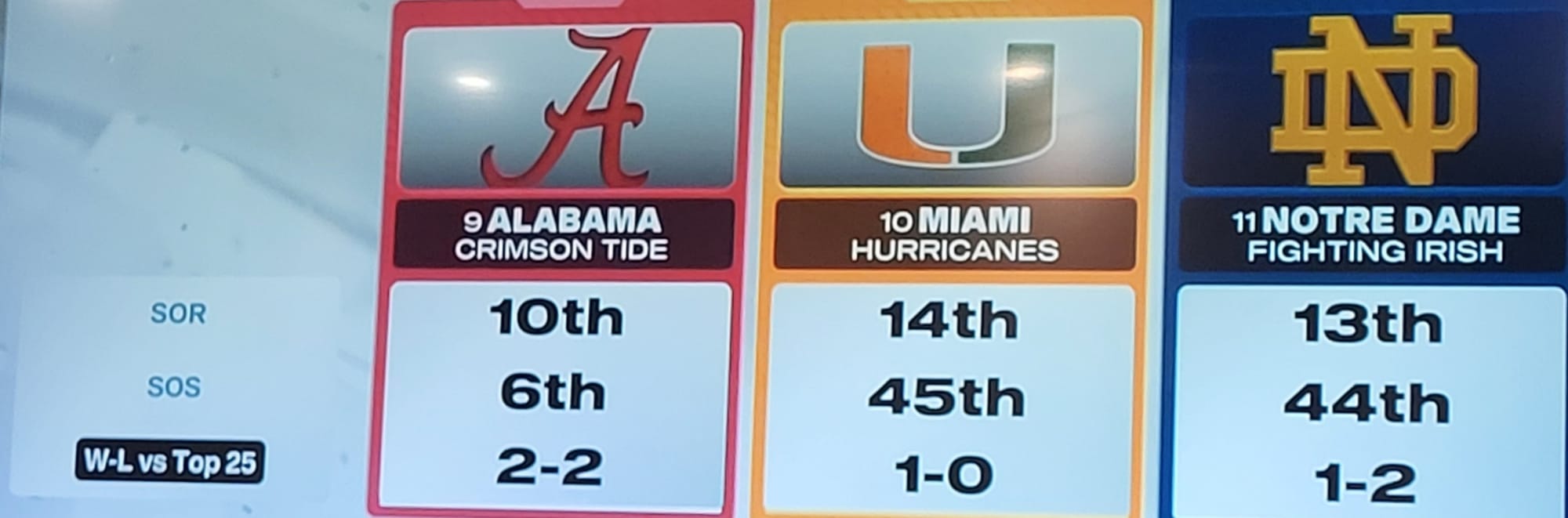 But to my brain, the more obvious question would be how did the Irish get slotted ahead of Miami in the first place? When the two teams met, back in August, the Hurricanes won. Yes, Miami went on to lose a couple. Yes , they won by only three points over the Irish. But they won. They WON.