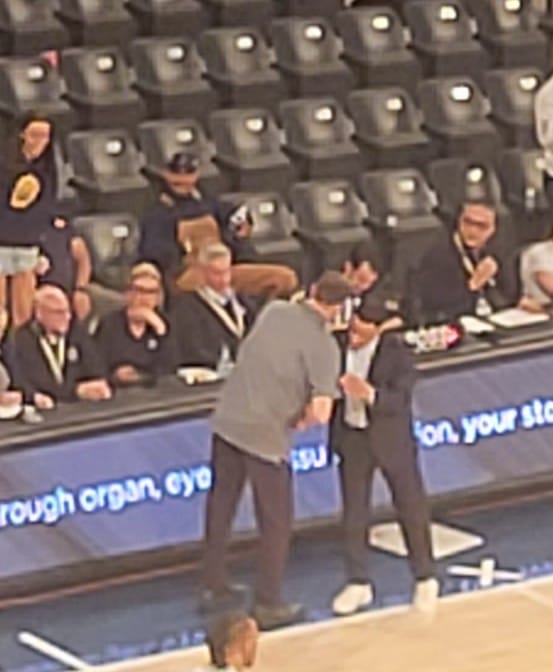 Georgia Tech Coach Damon Stoudamire accepts a conciliatory greeting from Cal Coach Mike Madsen immediately post-game at McCamish.